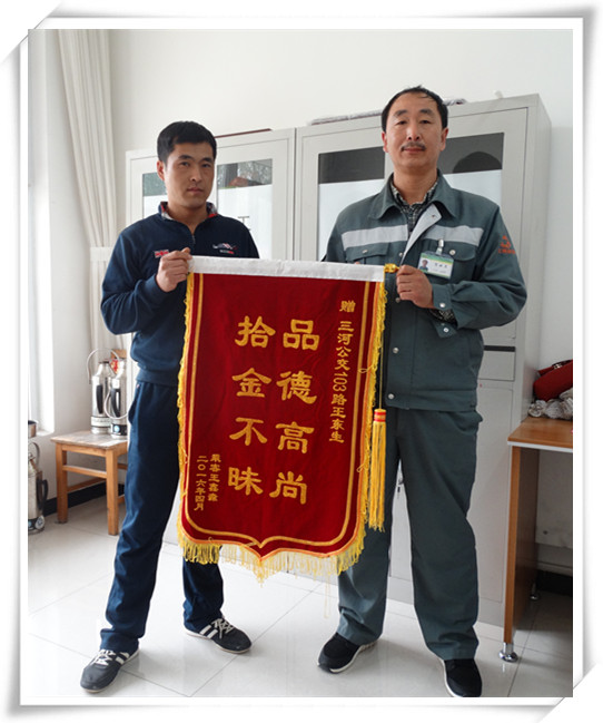 “谢谢王师傅帮我找到了手机,谢谢公交公司培养出如此优秀的驾驶员”。2016年4月7日,市民王先生带着一面绣有“拾金不昧,品德高尚”的锦旗走进办公室,连声感谢驾驶员王东生。