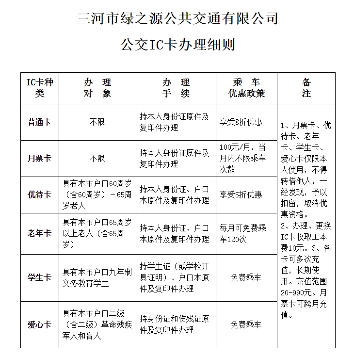 1、IC卡只能在装有车载收费机的三河市区公交线路上使用。